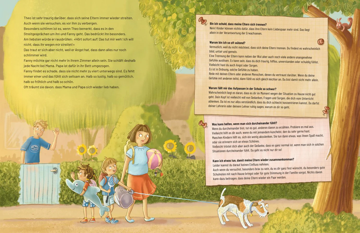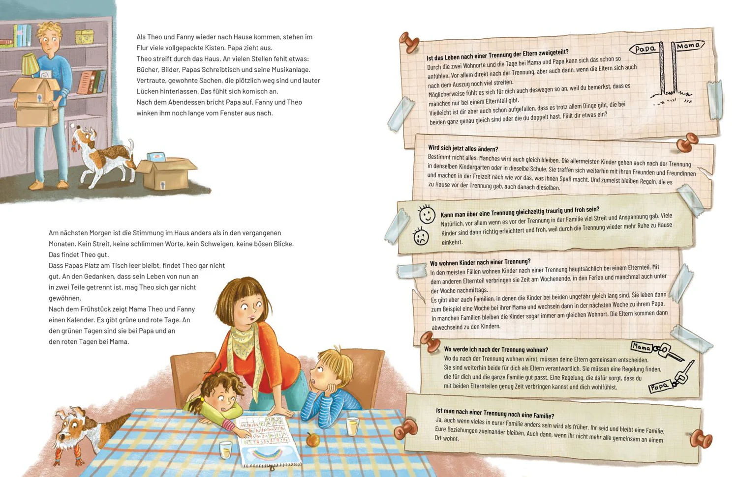 Mit Mama und Papa zusammen ist es am Allerschönsten, finden Theo und Fanny. Doch auf einmal schläft Papa im Wohnzimmer und es gibt immer wieder Streit zwischen Mama und ihm. Dann lassen sie sich sogar scheiden und Papa zieht aus. Theo und Fanny erleben schmerzhaft, was die Trennung der Eltern für sie bedeutet: Plötzlich gibt es Mama- und Papa-Tage, ein neues Kinderzimmer, Abschiede und alles fühlt sich anders an.